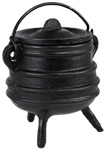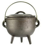 An unadorned cauldron with lid and carrying handle. These cauldrons are all individually sand molded leading to each cauldron being unique from every other. Made in a two part casting process; seams may be visible and rough on some cauldrons.This cauldron measures approximately 5 1/2 inchs at widest point and 6 1/4 inches to top of handle.