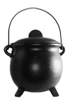 Of a rather unique design, this black, Cast Iron Cauldron is a solid tool for any altar. Set upon three legs, it starts wide at its base and tapers gently to a narrower mouth. Approx. 4 1/2" at widest point X 4 1/2" to top of lid.