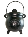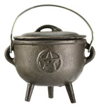 A cauldron bearing the raised image of a pentagram on both sides of the cauldron. These cauldrons are all individually sand molded and unique from every other. Made in a two part casting process; seams may be visible and rough on some cauldrons. This cauldron measures approximately 5 1/2 inchs at widest point and 6 1/4 inches to top of handle.